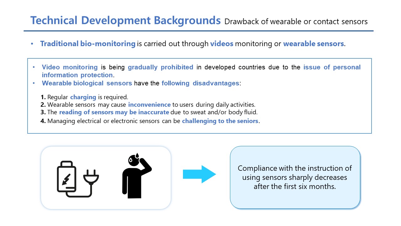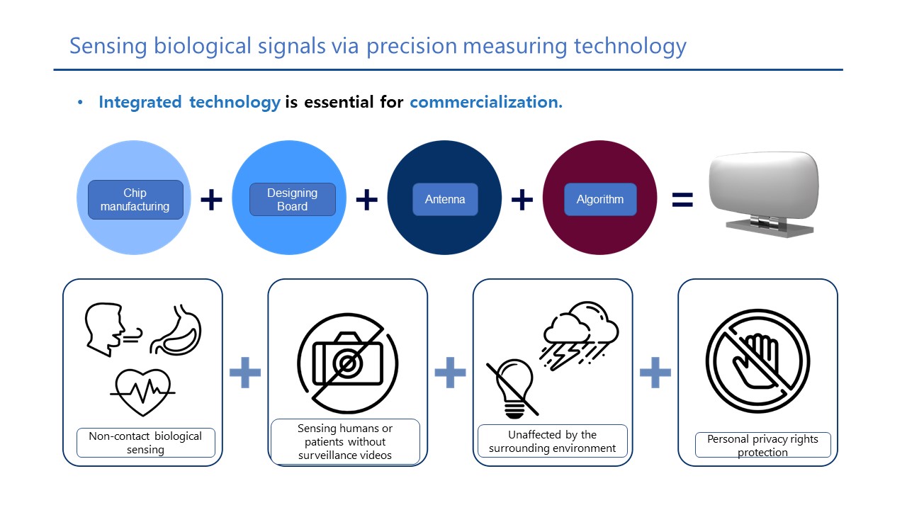 ○ Biological signals can be gathered in a non-contact manner through bio-radar systems. - Biological signals can be collected regardless of patients’ or humans’ movement. - Users can choose and adjust the range (space) of the detecting bio-signals. - Optimized signals can be achieved with adaptive signal filtering technology.